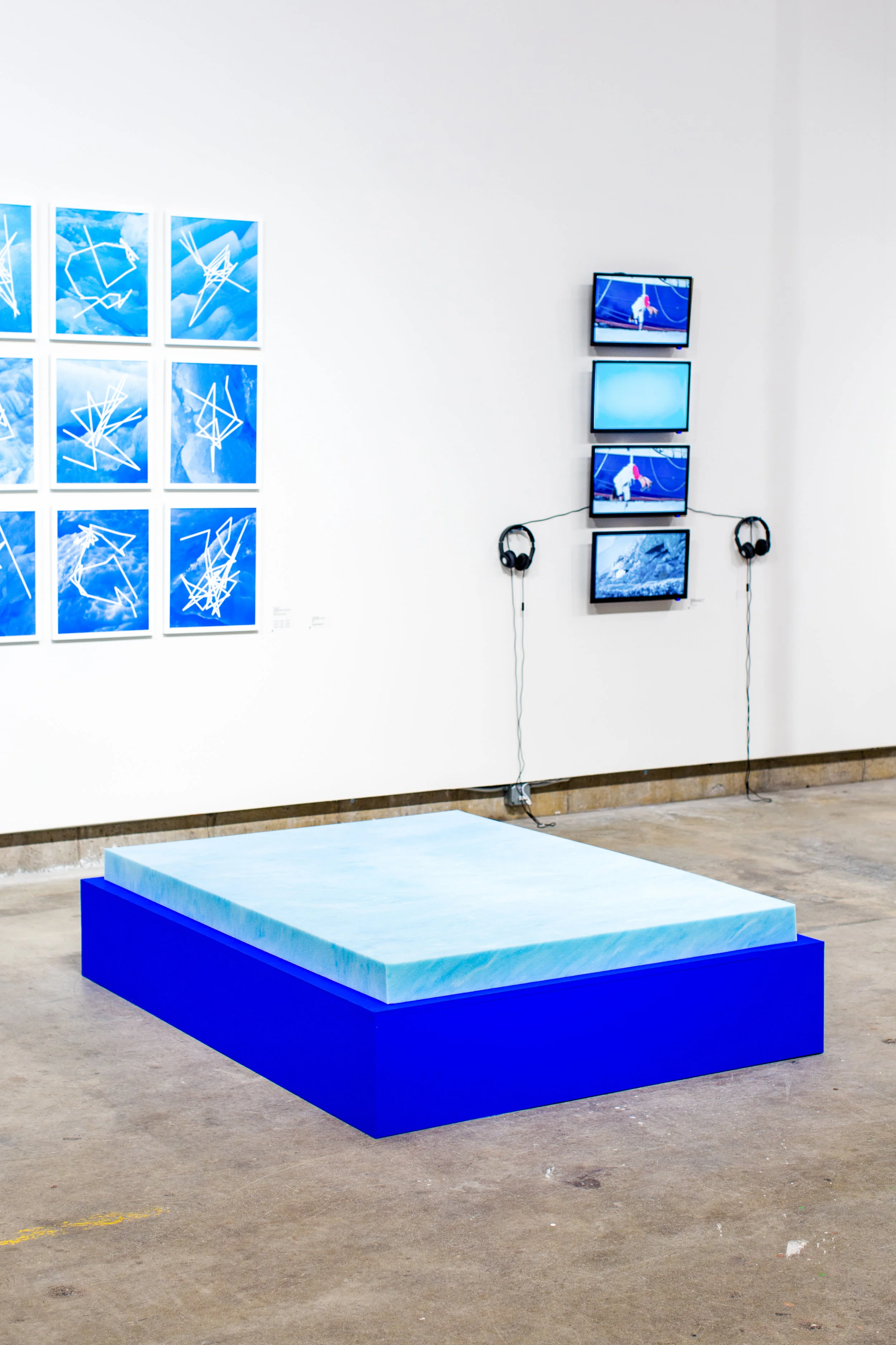 A series of drawings made from GPS data points collected in Svalbard while sailing aboard an ice-class Tall Ship. Each network of dense, overlapping lines is a record of the ship's natural movements in the water while tethered to its dropped anchor—using the ship itself to make the drawing. Directly in front of these works is a fake glacier made from “Arctic Sleep” blue memory foam that the viewer is invited to sit / lay on to look at the drawings. The sculpture allows the viewer to take Instagram selfies and imagine being in the Arctic without getting their butt wet on melting ice.