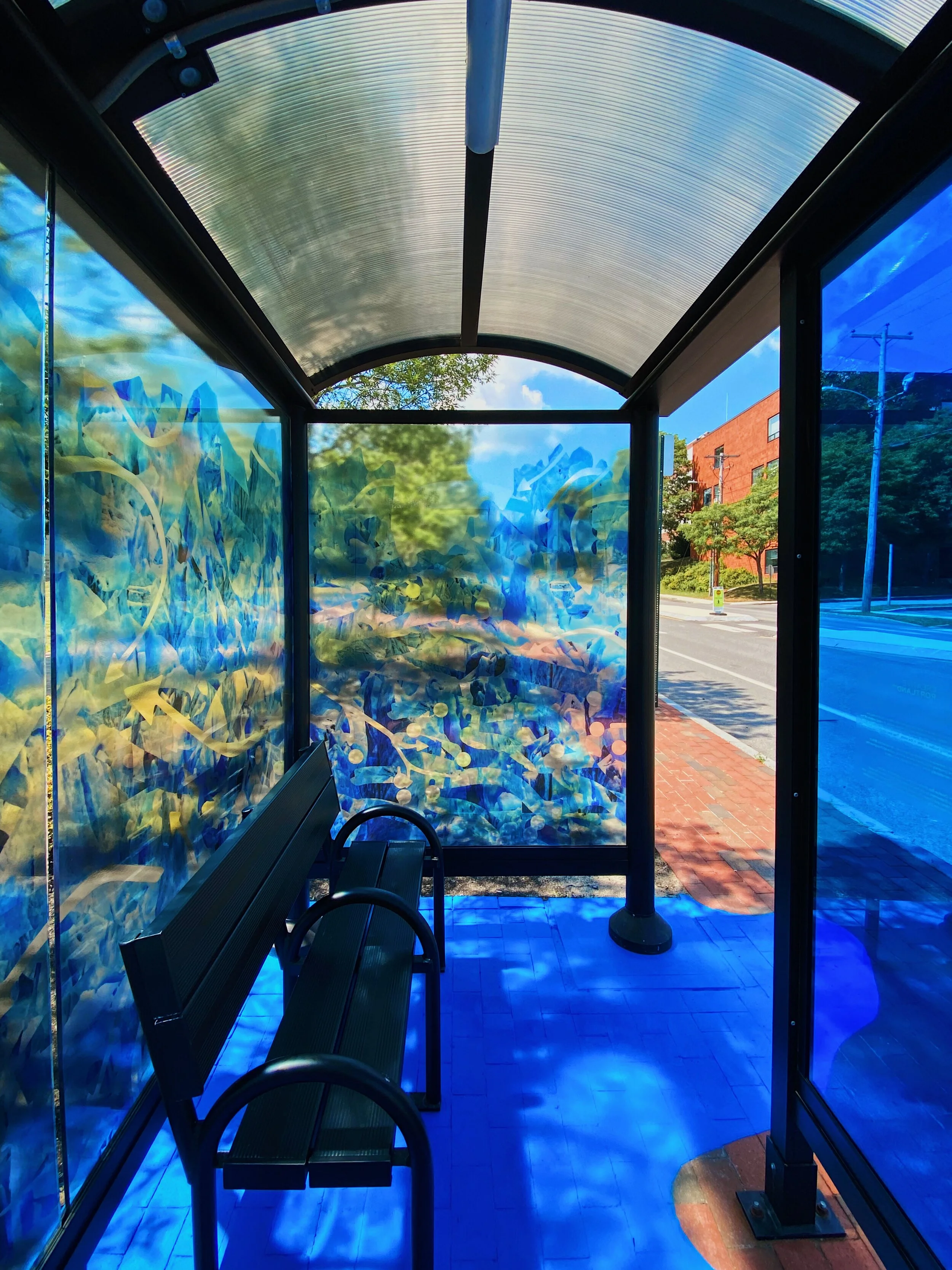 “Creative Portland invited Greater Portland artists to submit proposals for the Portland Creative Bus Shelter Initiative. Funded partially by a National Endowment for the Arts (NEA) Our Town Creative Placemaking grants program, matched by corporate sponsors and project partners Greater Portland METRO, GPCOG, Waterstone Properties, and Designtex. Pamela Moulton, project coordinator, supervised installation of the jury’s chosen designs.”